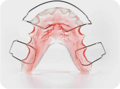 A classic, adjustable retainer made of acrylic and wire used to maintain teeth alignment after orthodontic treatment.
