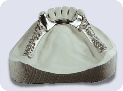 A metal base structure made from cobalt-chromium alloy, providing a strong, stable foundation for partial dentures with minimal bulk.